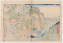 「山海見立相撲」は広重の最晩年に刊行されたシリーズで、山と海の対抗戦をテーマにした大判横絵20枚の揃い物です。山と海10枚ずつで構成されています。題名の書かれた軍配団扇は初摺が三色になっていて、後摺が赤一色に変わります。この作品には、北陸街道の難所で、現在の新潟県中南部に位置する亀割峠が描かれていますが、とても広重らしい構図で遠近感がよく表現されている一枚です。綺麗な青い海を敢えて小さく描き、より圧倒するかのようにふんだんに使われた緑色が印象的です。また、この山道を歩いて峠へ向かう人物の配置によって人々の流れが想像しやすく、まさにライブカメラを見ているような作品と言えます。版元 山田屋庄次郎